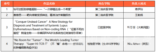 自今年3月份以来,学校稳步开展项目孵化培育工作,共收到参赛作品一百余项。经过激烈角逐,共有5个项目进入到全国总决赛。《Super “Band-Aid”— Originator of African refractory wound repair system based on the efficient combination of TCM and FGF21》项目获得金奖,《怡可欣胚胎移植凝胶——“一次移植达成一个希望”》等4个项目获得银奖。
